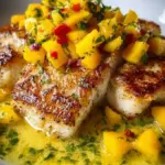 A tropical grilled Mahi Mahi dish drizzled with a creamy mango lime butter sauce that’s perfect for summer gatherings.