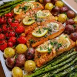 An easy and delicious meal perfect for busy weeknights, featuring tender salmon, crispy baby potatoes, and fresh veggies, all cooked on a single sheet pan.